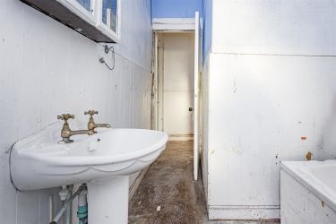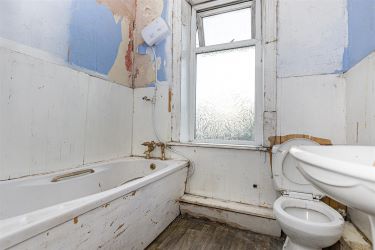 Fitted with a three piece suite comprising panel bath, pedestal hand wash basin and a low level wc, a uPVC