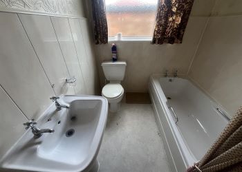 Fitted with a pedestal hand wash basin, panel bath with shower over, low flush wc, part tiled splashbacks, cylinder cupboard with storage over and a