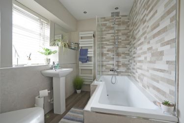Wash hand basin. Low flush W.C. Bath with mixer taps and shower over. Partially tiled. Towel radiator. UPVC double glazed window to rear elevation.