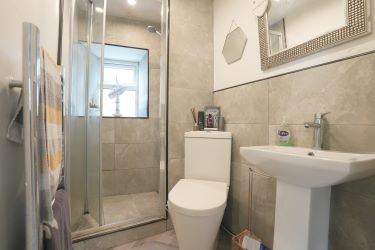 Wash hand basin. Low flush W.C. Shower cubicle. Chrome towel radiator. UPVC double glazed window to side elevation.