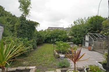 South facing, enclosed, patio and lawn garden with decking, mature trees and shrubs.