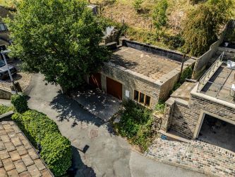 flush wc. There is a wood burning stove, independent twin garage doors, A